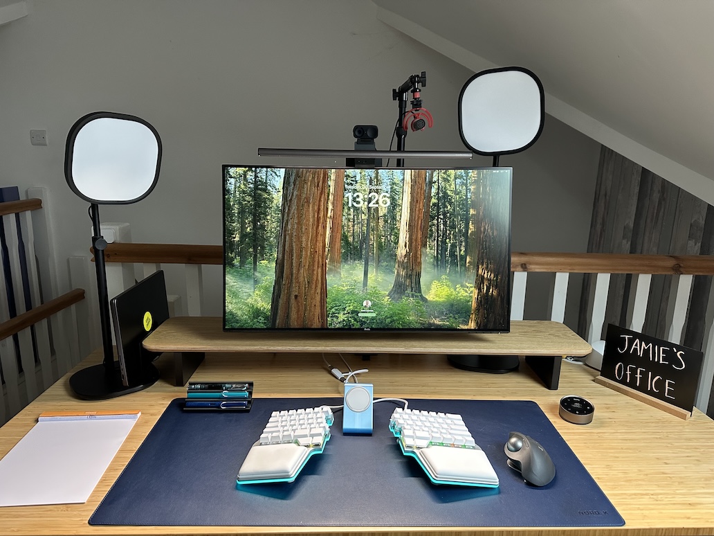 - Monitor bar BenQ Halo 2. This is a new addition but I’m loving it so far, particularly as we go into the dark days of autumn. It provides a nice soft light down on the desk without directing it in my eye or on the screen itself. It also holds the webcam and the desk-based control is the nicest product design I’ve experienced in a long time. Ridiculous amounts of joy.